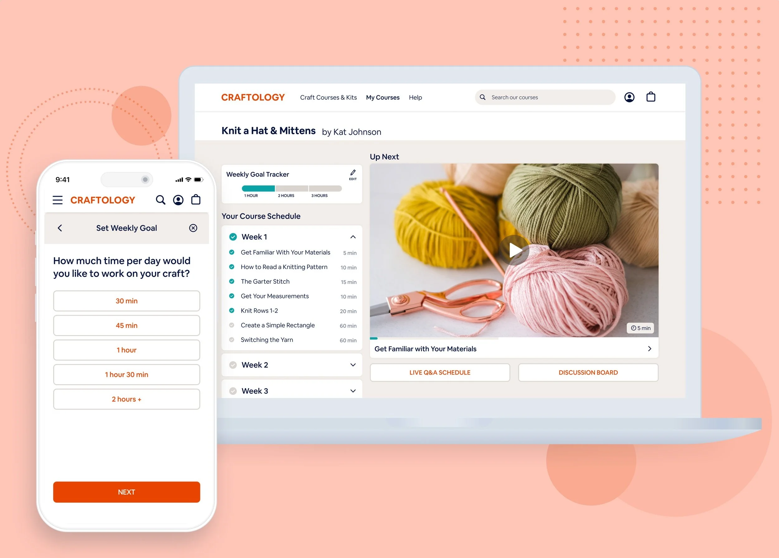 A responsive website with step-by-step video tutorials, goal tracking and Q & A sessions to help crafters stay on track and get the help they need to level up their skillset and finish their projects.