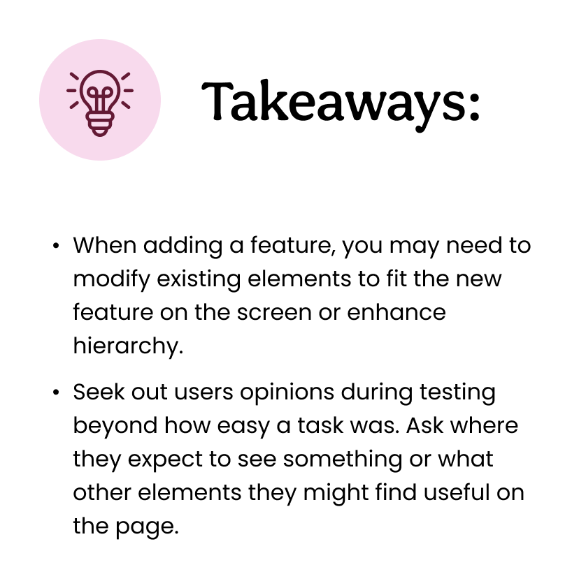 Usability tests provided me with valuable insights into what areas of my design needed iteration. I narrowed down to the 4 most impactful changes I could make to my prototype.
